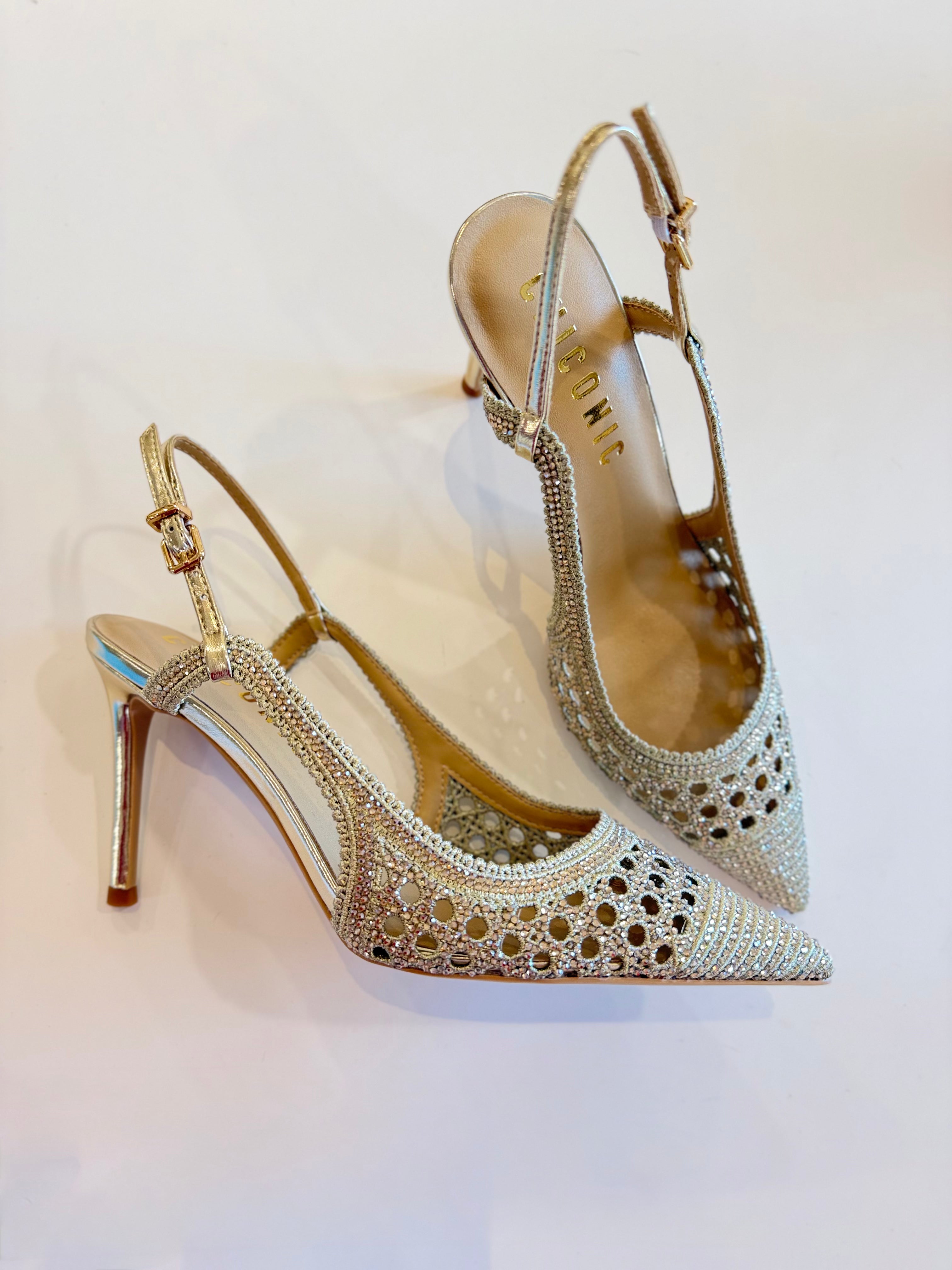 Slingback realizzate in tessuto traforato con applicazione di microstrass; fondo cuoio con iniezione in gomma; tacco 90 mm