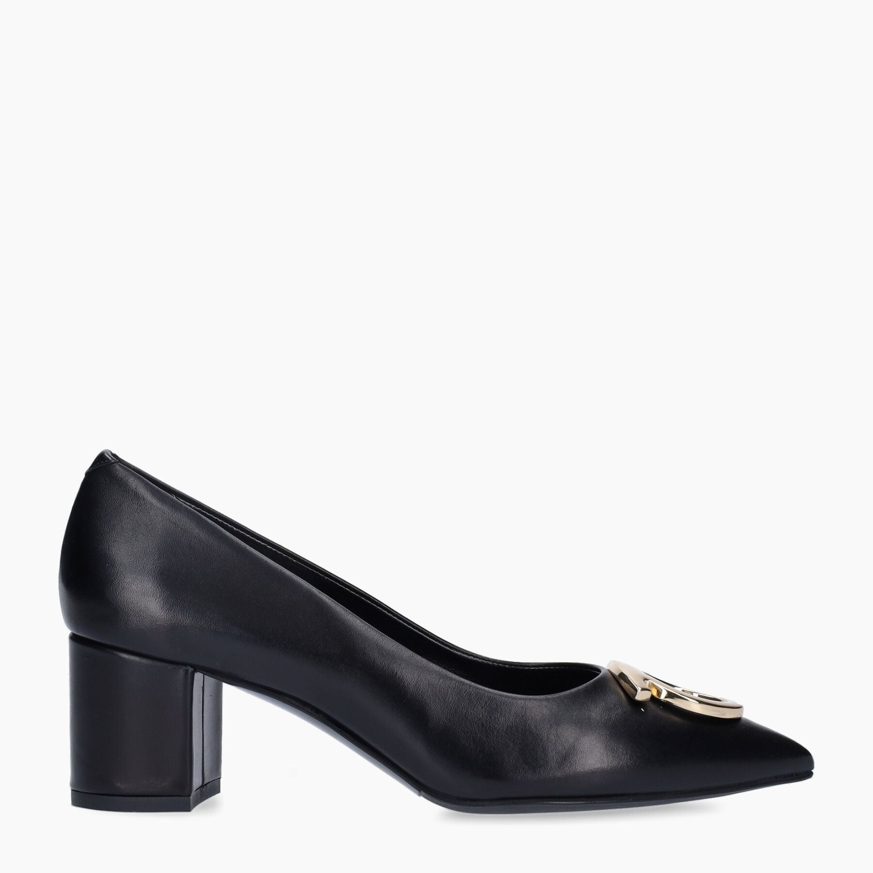 Décolleté con tacco,tomaia in pelle, colore nero. Dettaglio in oro.