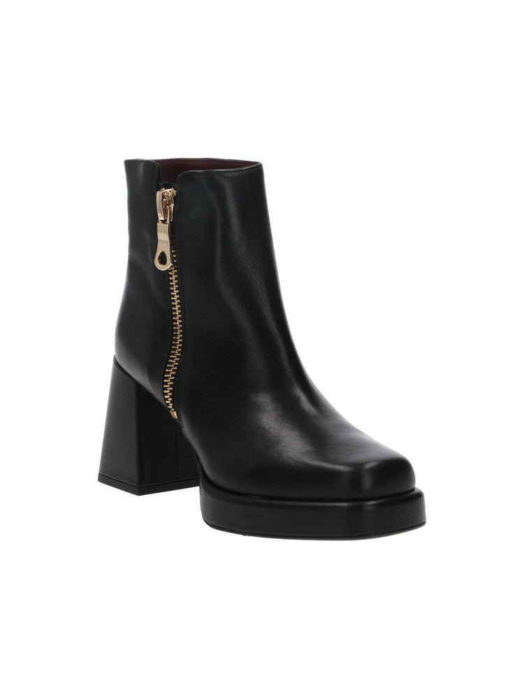 Tronchetto in pelle nera con zip laterale oro e sottopiede in pelle. L'articolo ha il tacco largo, alto 8 cm e il plateau di 2 cm.